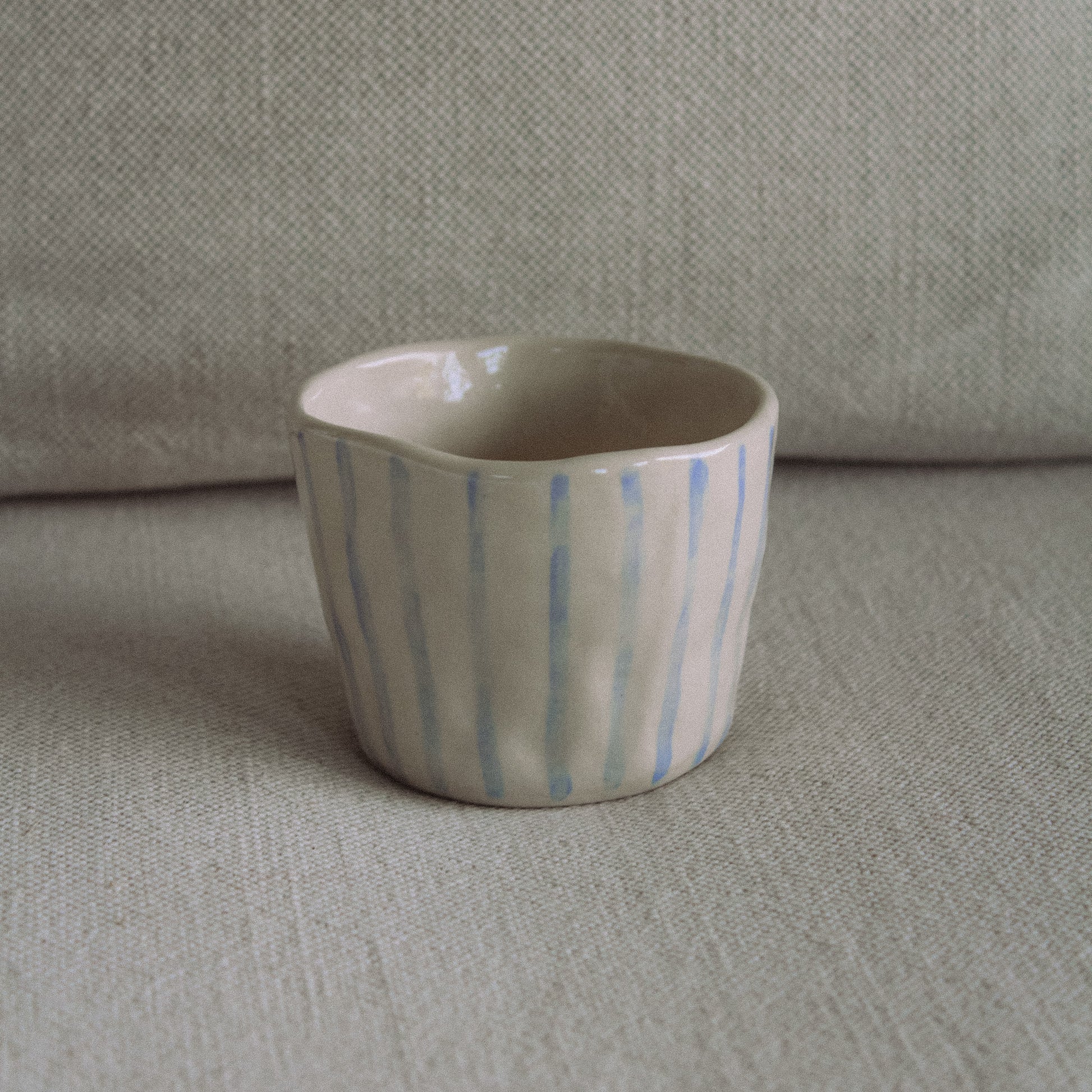 The Azure Cup is hand-painted with thin blue lines for a classic feel. A small cup, perfect for a shot of espresso, an antipasto tray or a salt bowl.
